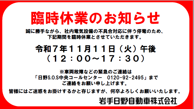 2025/11/10令和7年11月11日 臨時休業のお知らせ 2025/9/6岩手県立高田高等学校のみなさんが見学に来られました 2025/7/25夏季休業のお知らせ 2025/7/5東北支部野球大会に出場しました 2025/5/126月14日(土)中古車展示会 開催のお知らせ