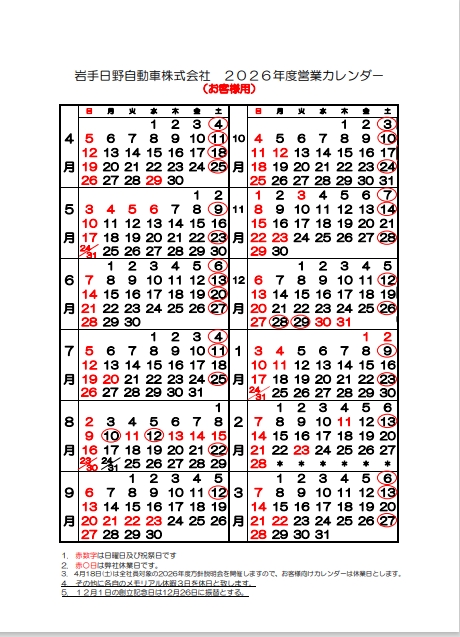 2026/3/18整備料金改定について 2026/2/252026年度営業カレンダーを公開しました 2025/9/6岩手県立高田高等学校のみなさんが見学に来られました 2025/7/25夏季休業のお知らせ 2025/7/5東北支部野球大会に出場しました