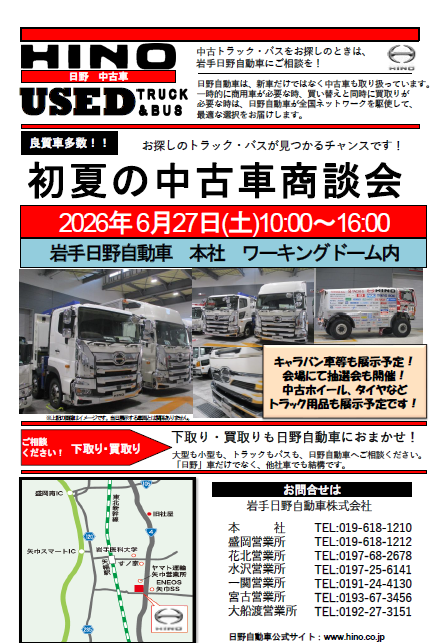 岩手日野自動車 本社 ワーキングドーム内にて中古車展示会を開催致します。